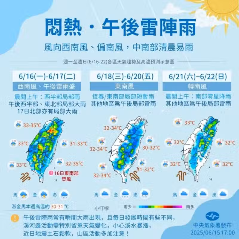 周三 (18) 到周五 (21) 雖然仍會有些降雨,但範圍和強度都小,未來10天大致都為多雲到晴、高溫炎熱,午後有局部短暫雷陣雨的天氣型態。