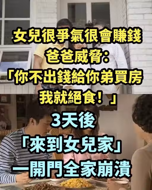 女兒很爭氣很會賺錢!!爸爸威脅:「你不出錢給你弟買房,我就絕食!」 3天後「來到女兒家」一開門全家崩潰