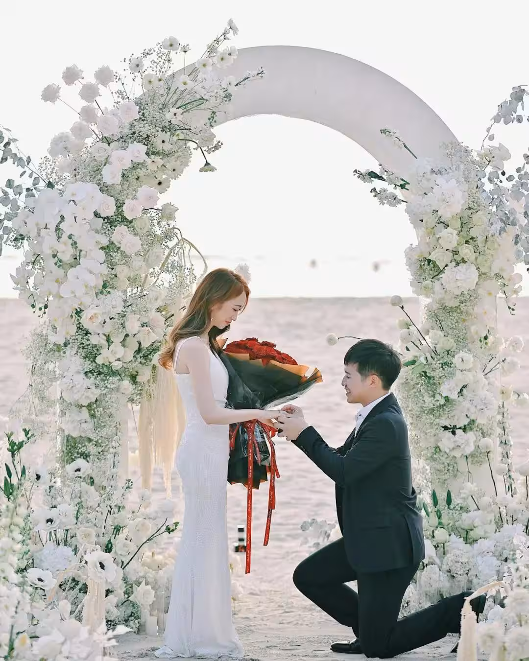 身穿修身低胸禮服的曾曉婷與老公在照片中甜蜜親吻,丈夫還跪下親吻她的手,曾曉婷亦小鳥依人般依偎在老公身旁,畫面相當甜蜜幸福。