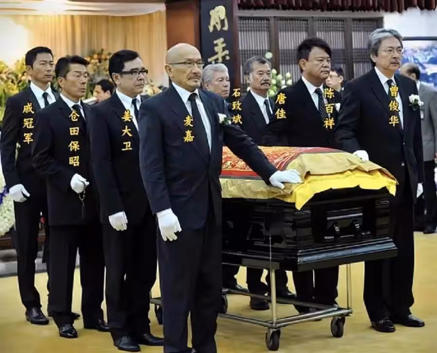 葬禮上,靈堂內飄散著淡淡的檀香,八位西裝革履的抬棺人同時彎腰,這一抬棺陣容足以讓所有港片迷的DNA都為之震動。政壇大佬曾俊華、喜劇鬼才陳百祥、日本空手道宗師倉田保昭等人的出現,讓人不禁感嘆,這哪裡是普通的葬禮,分明是江湖最後的武林大會。