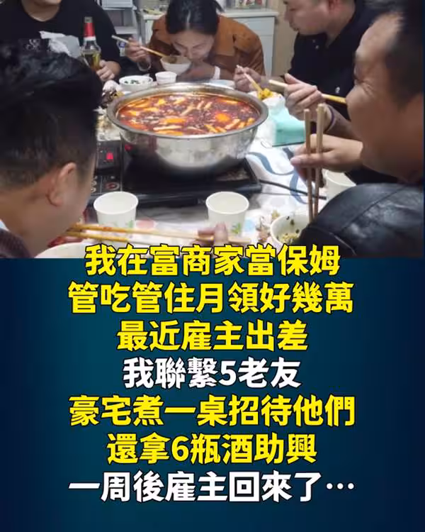 我在富商家當保姆,管吃管住月領好幾萬,最近僱主出差,我聯繫5老友、豪宅煮一桌招待他們,還拿6瓶酒助興,一周後僱主回來了