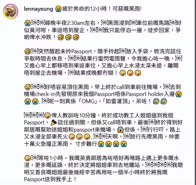 楊卓娜發文透露,凌晨2點半左右,黑雨導致車位前的馬路嚴重積水,"像黃河一樣洶湧":"車開不回家,我只能停在路邊,徒步走回去,差點被水衝倒!突然想起沒拿護照,趕緊隨手塞進手袋。