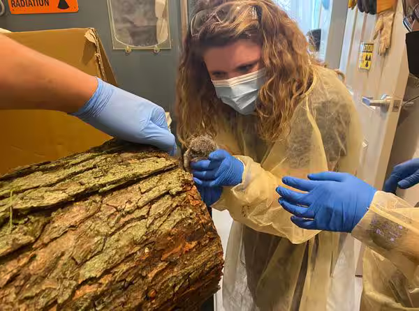 當時切除作業才進行到一半,眾人就聽見樹幹中突然傳出陣陣鳴叫,這才驚覺裡頭可能藏著小動物,因為不確定究竟是什麼情況,他們決定把整個樹幹運到新英格蘭野生動物中心(New England Wildlife Center)檢查。