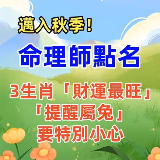 慢慢進入秋天的季節,白天感受到熱意、晚上又有徐徐微風的涼意,日夜溫差大,外出也要記得多帶件小外套!邁入秋冬12生肖運勢大解析,點名這三大生肖財運最旺!