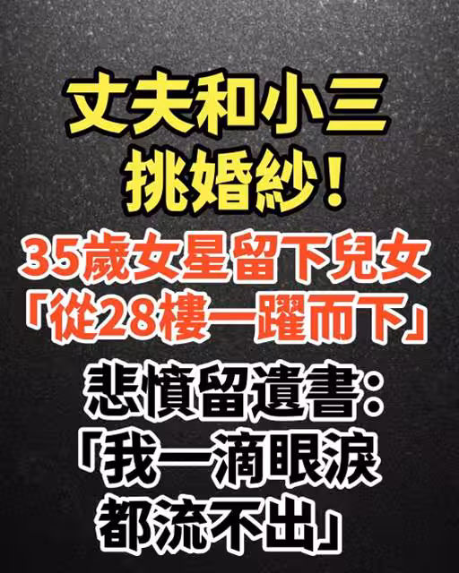 丈夫和小三挑婚紗!35歲女星留下兒女「從28樓一躍而下」 悲憤留遺書:「我一滴眼淚都流不出.」