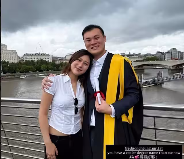 畫面中可見,張卓鏗身穿畢業袍走上台,接過證書後還向台下揮手致意,之後更拿著證書和妹妹合影。張卓姿親昵地靠在哥哥肩膀上,兩人互動溫馨,盡顯兄妹情深。