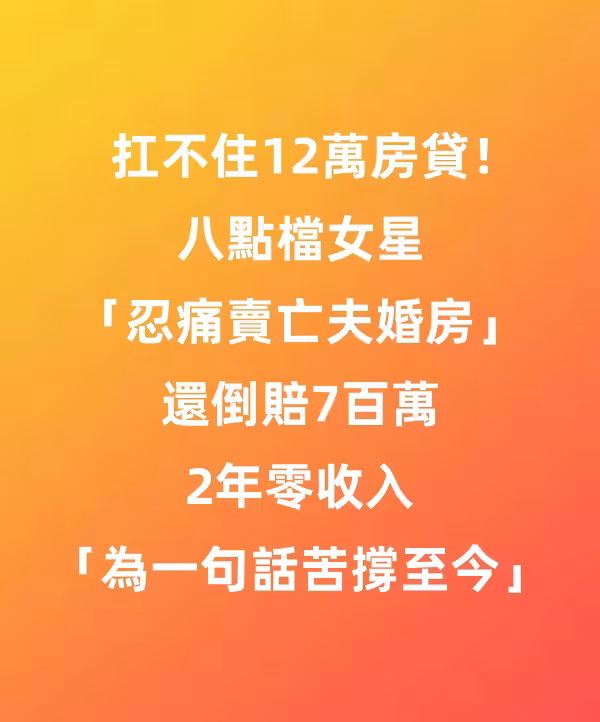 扛不住12萬房貸!八點檔女星「忍痛賣亡夫婚房...」還倒賠7百萬 2年零收入「為一句話苦撐至今」