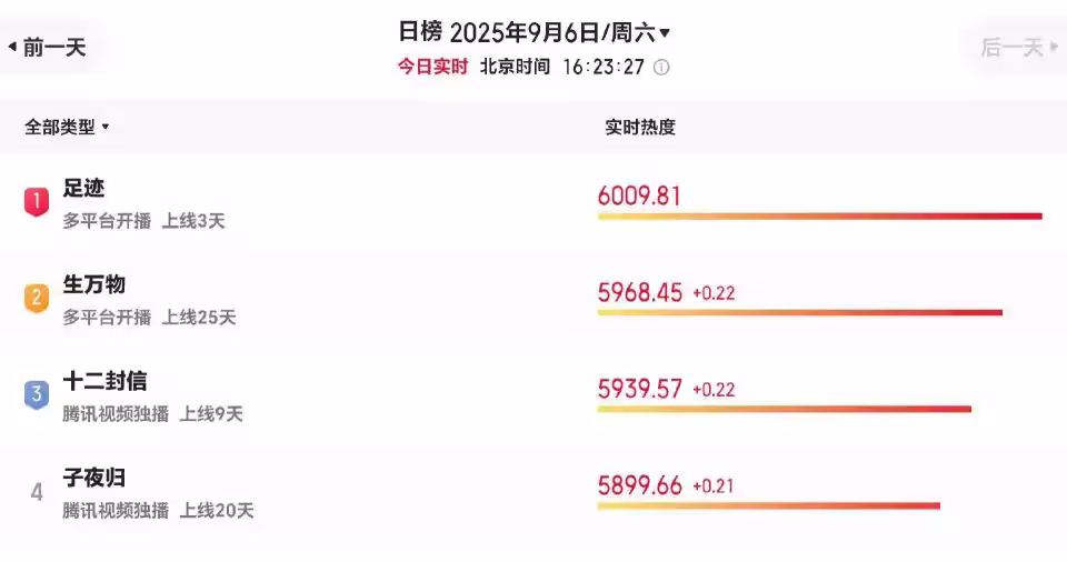 8月份剛播完《生萬物》,9月初就又跟了一部《足跡》,而且從劇集熱度來看,《足跡》上映三天就擠下了《生萬物》《十二封信》等高品質劇集,竄到了榜首的位置,確實有點東西!