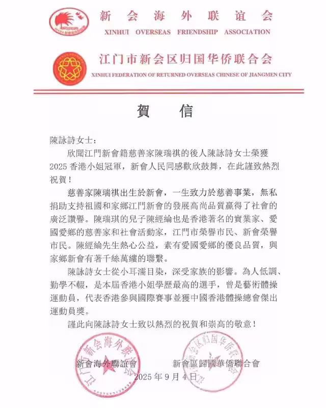 近日(9月7日)陳詠詩更早在社交平台分享,自己收到來自家鄉新會海外聯誼會及江門市新會區歸國華僑聯合會的賀信,認真光宗耀祖。