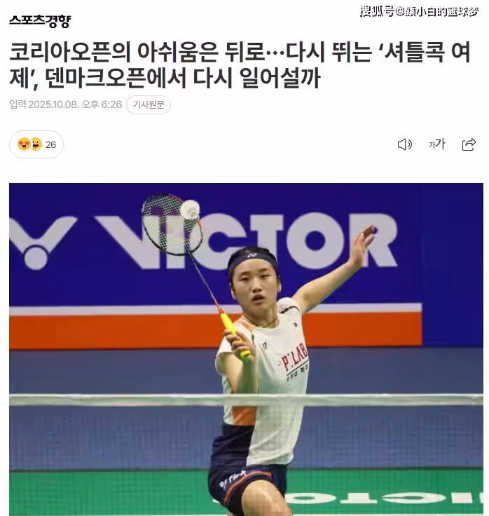 北京時間10月8日,韓國媒體《體育傾向》預熱了世界第一安洗瑩的丹麥公開賽,標題《羽毛球女帝在韓國公開賽折戟後能在丹麥公開賽站起來嗎?》