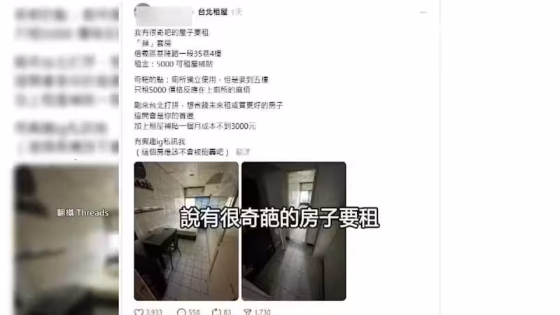 台北市信義區月租金卻只要5000元,還可以租屋補貼,但廁所要爬到別層樓才能上。