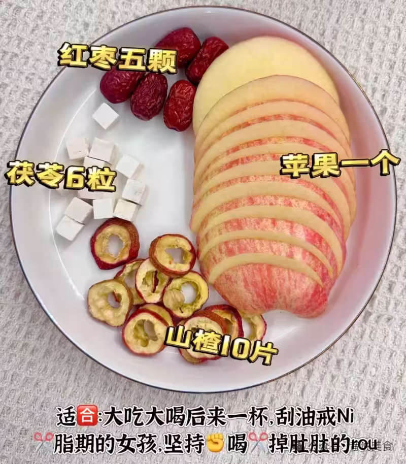 小貼士:山楂別放太多不然太酸刺激胃,8克剛好;茯苓要提前泡軟不然煮不透;喝完水可以把蘋果吃掉,飽腹感強還不胖。