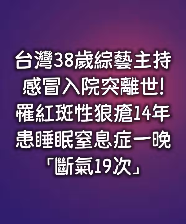 台灣38歲綜藝主持,感冒入院突離世!罹紅斑性狼瘡14年 , 患睡眠窒息症一晚「斷氣19次」