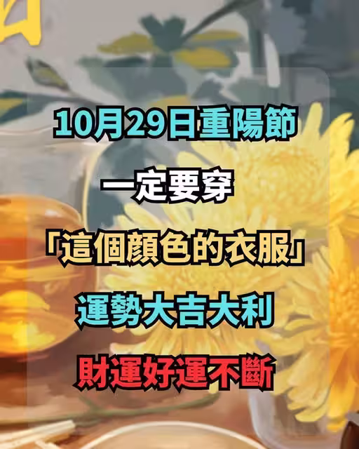 10月29日重陽節不只要登高賞菊,更要「穿對顏色」!命理師獨家揭秘:重陽節是「陽氣最頂」的日子,穿對顏色可旺全年運勢,財運、好運不斷!10秒看懂「旺運顏色」與穿搭技巧,讓你從頭旺到尾!