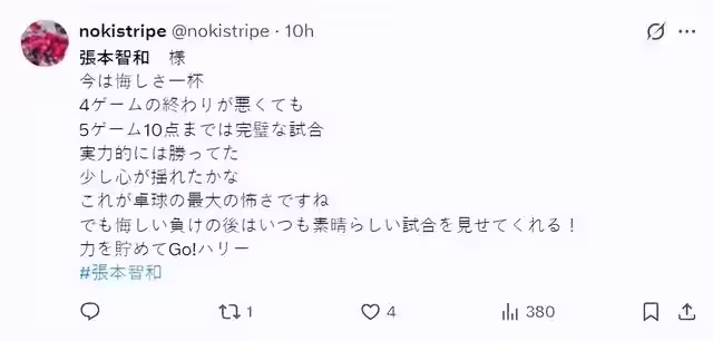 日本球迷們這一次也沒有炮轟張本,這位球迷寫道:決勝局10-6領先都輸了,看起來主辦方的優勢巨大,在蒙彼利埃有主場加成。