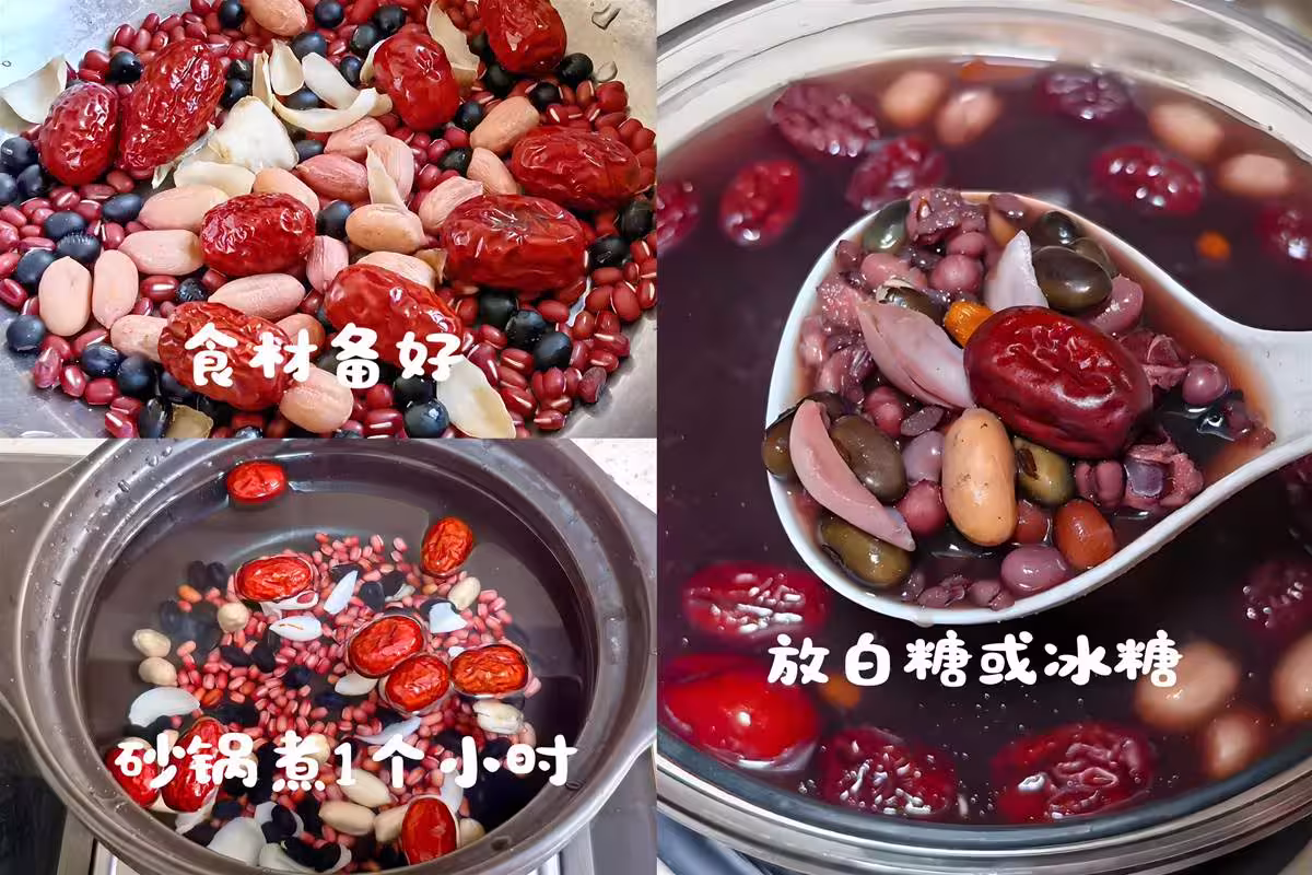 這碗湯啊,紅豆黑豆祛濕利水,花生紅棗是健脾養胃、補氣血的好手,而百合則專門用來潤肺安神,對付秋燥引起的乾咳和心煩再合適不過。喝下去,從胃到心都暖暖的、潤潤的,特別適合感覺秋燥明顯、睡眠淺的朋友。
