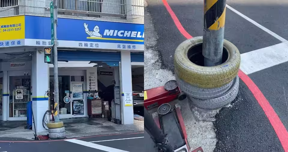 台中「紅綠燈套3輪胎」怎麼放進去?網友笑稱大仙施法 老闆解答了 30年已救2命