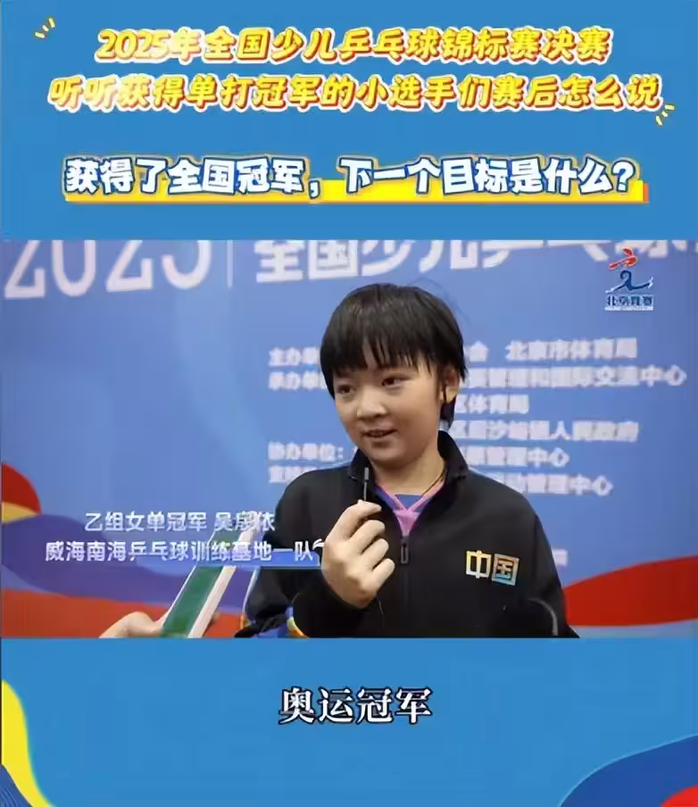 在奪冠之後接受採訪,當被問到奪得全國冠軍的下一個目標是什麼,吳扆依直言不諱:「奧運冠軍!」吳扆依的偶像是孫穎莎,今年上半年獨自在內蒙古參加比賽,吳扆依接受採訪時說了一句話:「孫穎莎在場上都不哭,我在場上怎麼能哭呢。」這就是榜樣的力量,期待這位心懷遠大目標的小朋友在未來繼續蛻變!