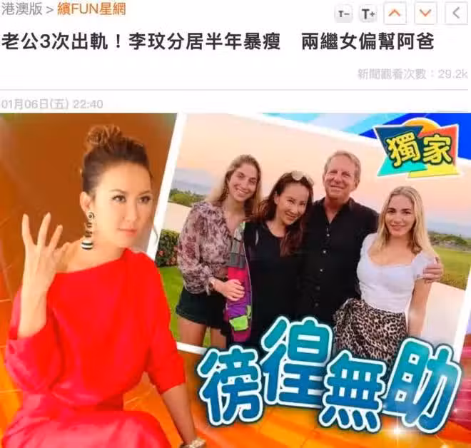 現年48歲樂壇天后李玟與加拿大籍富商老公Bruce於上月被港媒曝出婚變。據悉老公在二人婚後多次偷吃不收斂,李玟決定分居。此外倆繼女力挺父親,令李玟孤立無援備受委屈,其體重一度跌至42.3公斤。