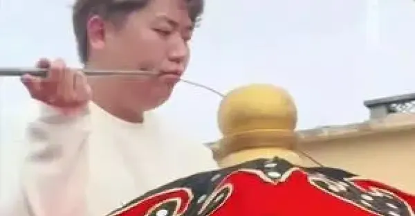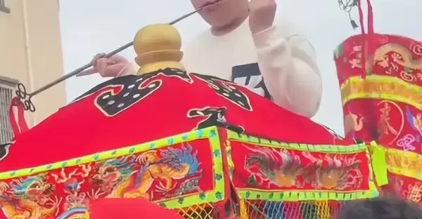 全紅嬋家裡擺宴席鬧元宵,照片懸掛在游神車,哥哥表演穿令箭習俗