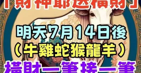 「財神爺送橫財」明天7月14日後,橫財一筆接一筆的生肖