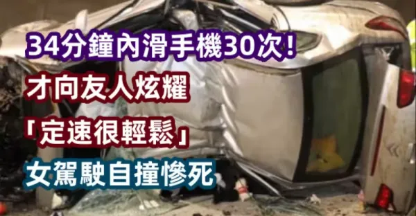 34分鐘內滑手機30次!!! 才向友人炫耀「定速很輕鬆」女駕駛自撞慘死