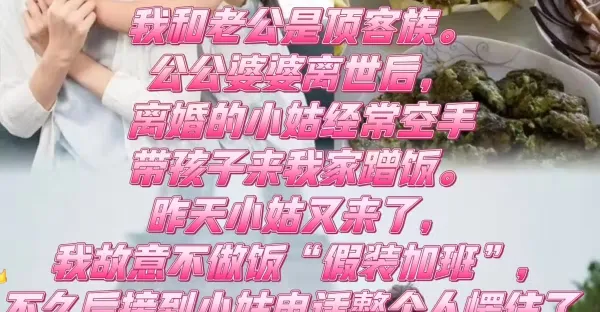 我和老公是頂客族。公公婆婆離世後,離婚的小姑經常空手帶孩子來我家蹭飯。昨天小姑又來了,我故意不做飯「假裝加班」, 不久後接到小姑電話整個人愣住了