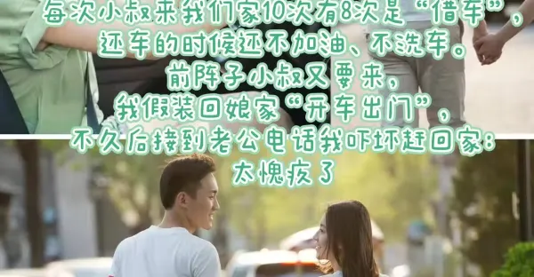 每次小叔來我們家10次有8次是 「借車」,還車的時候還不加油、不洗車。前陣子小叔又要來,我假裝回娘家「開車出門」,不久後接到老公電話我嚇壞趕回家:太愧疚了