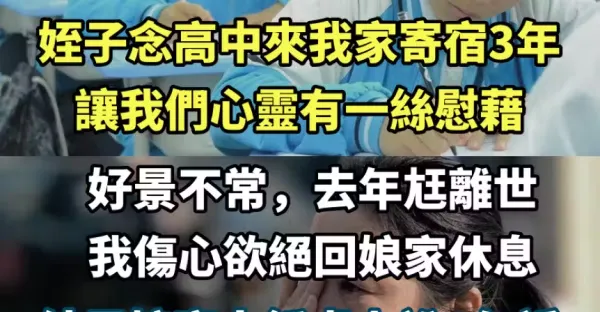 和先生是頂客夫妻,侄子念高中來我家寄宿3年,讓我們心靈有一絲慰藉,好景不常,去年尪離世,我傷心欲絕回娘家休息,結果娘家人飯桌上說1句話,再也沒娘家可回