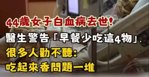 44歲女子白血病去世了!!醫生警告「早餐少吃這4物」很多人勸不聽:吃起來香問題一堆!